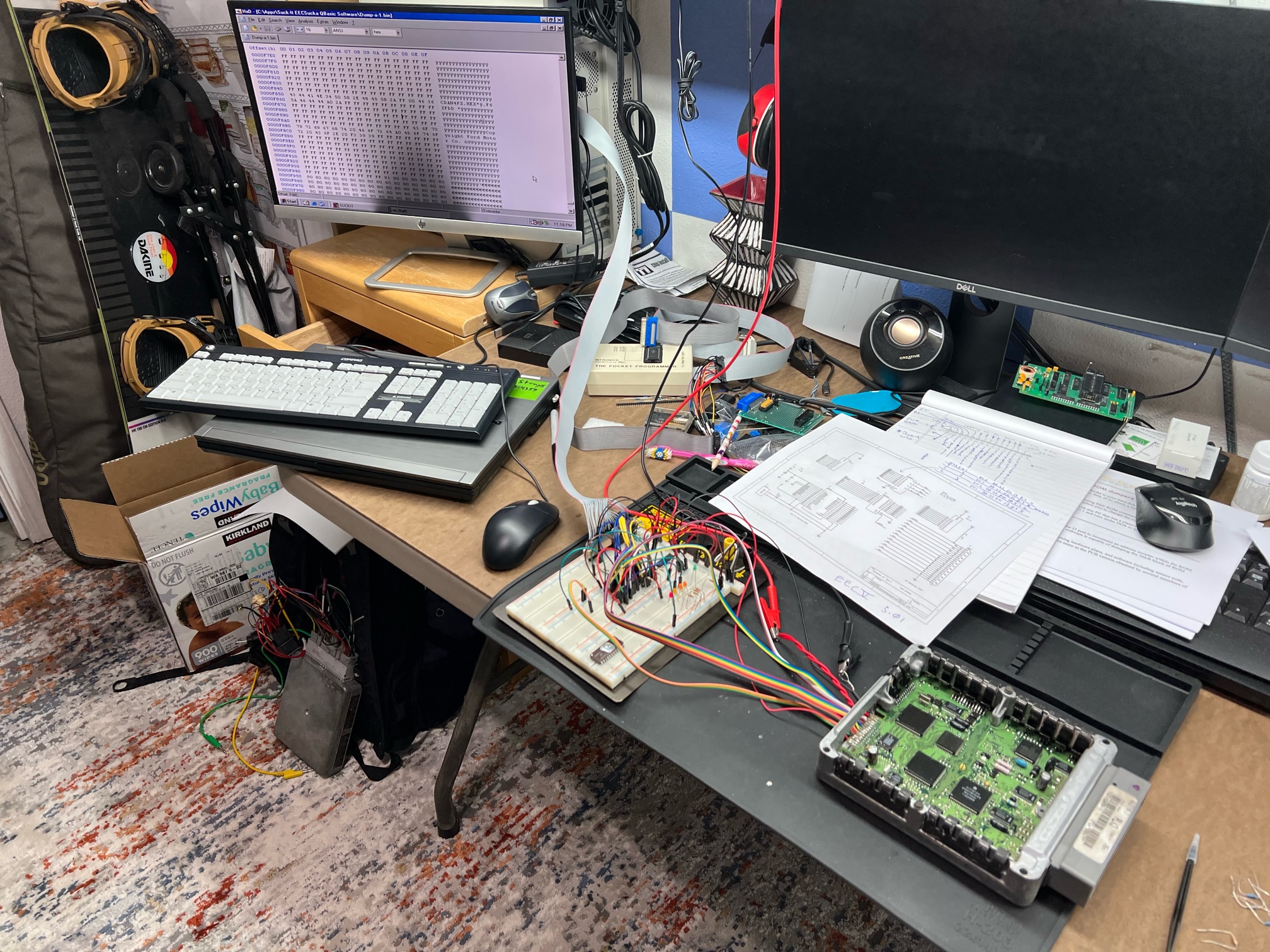 The hardware I've kludged up in these pictures is my best attempt of what I think was called EECsukaJR or maybe Son of EecSucka. It's using Andrew March drawing revision 5.01 titled EECSUKA II EECV. I'm using WIN98SE on an old Pentium3 1G computer with a built in parallel port (This is being done with standard LPT (not bi-directional). I'm using a program written by Craig Motes called SUCKIT.exe that reads for all four banks each getting their own output file. I would love it if anyone can help me determine if my reads are working. I'm using an old hexeditor called Hxd on the old WIN98 box and looked through the BIN files.