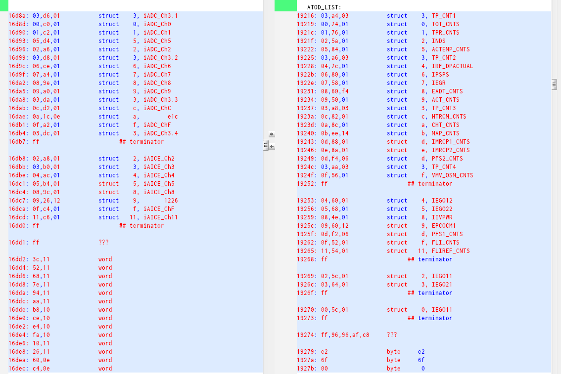 Thank you for responding so quickly. I do know how the tables affect the engine and stuff like that, the tuning side of it I feel pretty capable with, It is identifying what a particular subroutine, ad input, tables, and functions actually are for. Like in the example above, iADC_CH3 turns out to be tp_cnt. I am guessing that is not always the case and comparing to other already disassembled bins and definition files is the only way to narrow down what the specific function, or channel or table actually is, or does, in tuning terminology. and what the actual lookup tables are pointing to, like the actual value of the table, ex: volts, counts, etc.