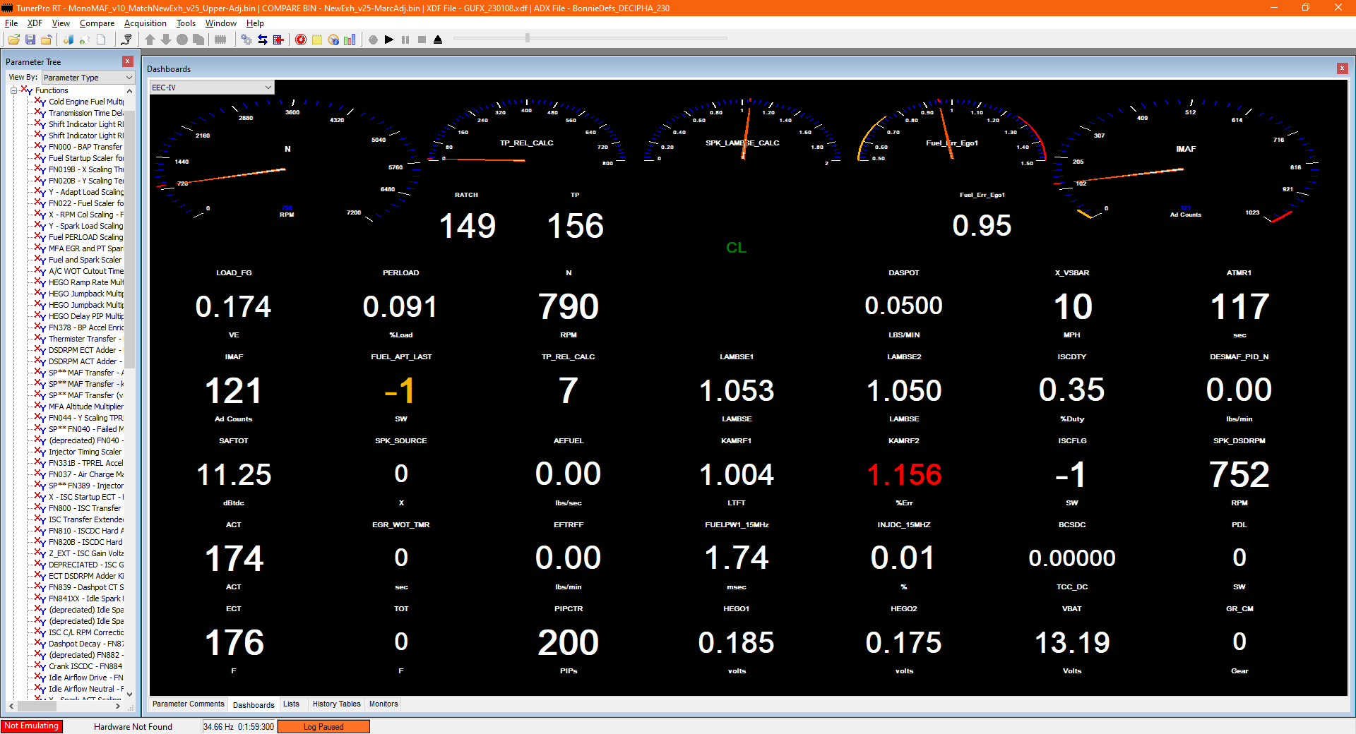 It seems to mostly maybe always happen when I'm cruisin or hittin the throttle to say 40-50+ then go to slow down sharply. These are all tuning runs too so a bit more aggressive than normal driving but it's happened with all my tests/MAF curves good and bad for over a year now. The calcs from the failed KAMRF2 value is part of the calcs and it starts to run bad and will stall if I don't recover it with throttle when this occurs. If I bump the throttle a bit and hold it or cuz I have no choice but to stop, shift to Neutral and rev up just a bit to say 1100+ RPMs, everything is fine, KAMRFs is all normal again, 1:1ish w/ KAMRF1 but if I don't rev it, it will stall. Once I recover it for a few seconds, I can sometimes let it idle and it'll be fine but not always. I can start up again too if it stalls, but clearly not ideal.