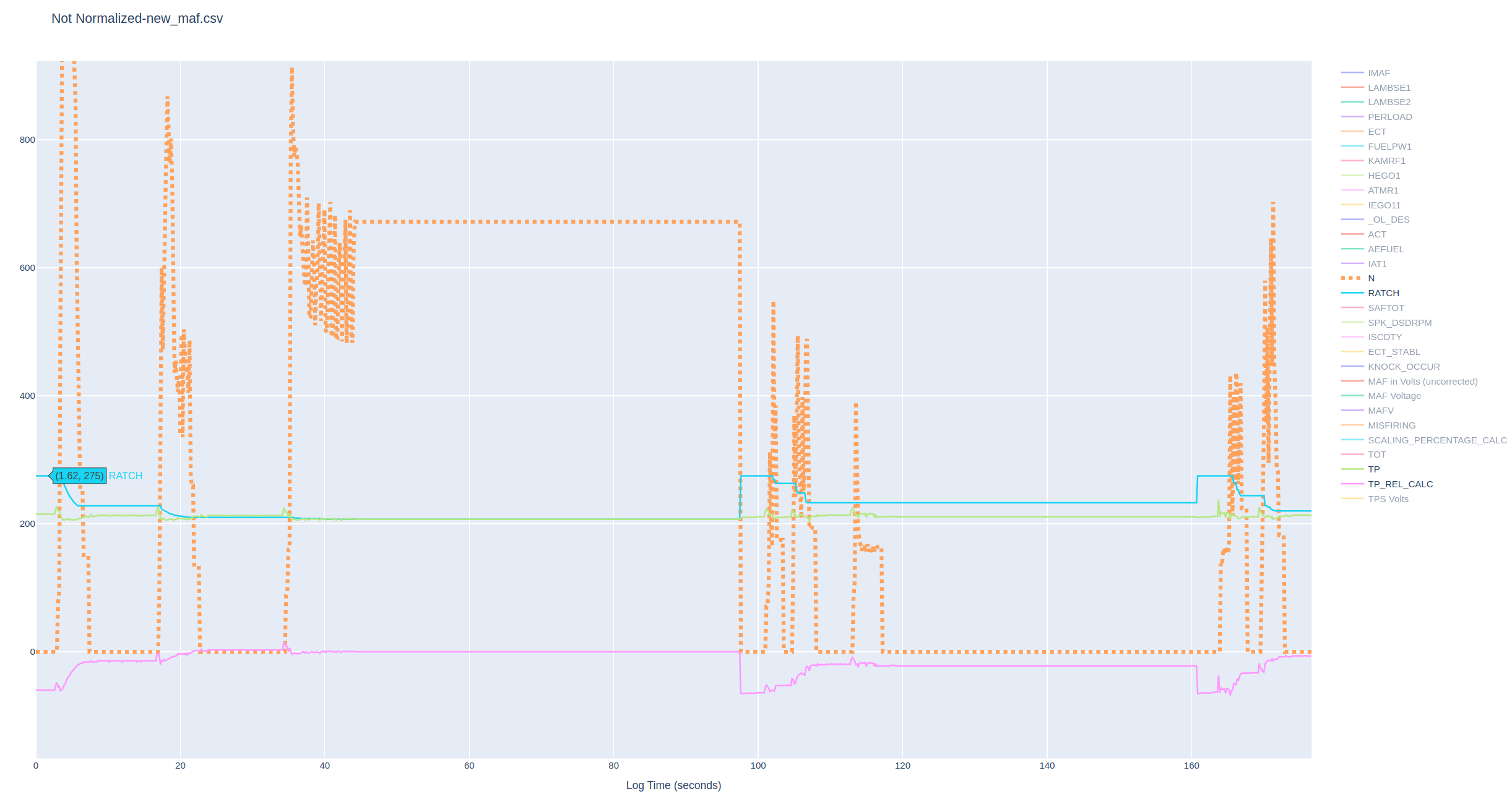 I just noticed something in the logs - every single one of my logs starts with a TP_REL_CALC value of around -63, slowly rising to 0 over ~20 seconds. RATCH seems to reset to 275 with every power cycle and drop slowly. Is this a bad/out of adjustment TPS, or does it look normal? Could a negative TP_REL_CALC throw off a table lookup or cause some other undefined behavior? RATCH in blue, TP in green, TP_REL_CALC in purple, you can see for about the first 20 seconds RATCH is higher than TP, and again same pattern just before 100 sec.