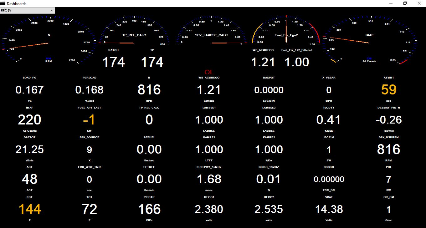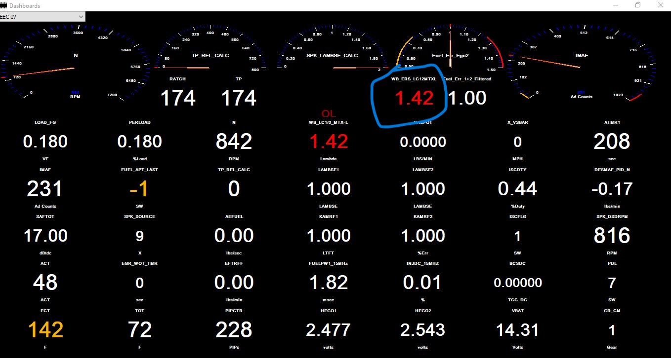 Even though I'm using this program for EEC-V application, can I use the EEC-IV dashboard? The EEC-V dashboard is too big for my two different laptop screens and chops into the bottom row. Also the EEC-IV dashboard appears to have sufficient pids that I need. One simple question though. I need to change the preset wideband on the EEC-IV to my AEM 30-4110. I'm seeing erroneous feedback from the gauge setting being incorrect. I figured out how to change it. Did I make the right choice? WB_AEMUEGO. See second picture.