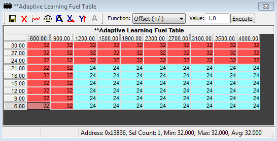 i believe the addaptive update table should be 10x9... _lst found 4 lots of 10x9 tables but when looking at the data contained in them they dont look right.. eg the 10x9 table at 147D8 has 4 cells with -128 values ... this makes no sense as -128 would mean reference row 12 column 8 presumably or heck it could even mean row 1 column 28 ... there are not 12 rows and there are not 12 columns either in this table..