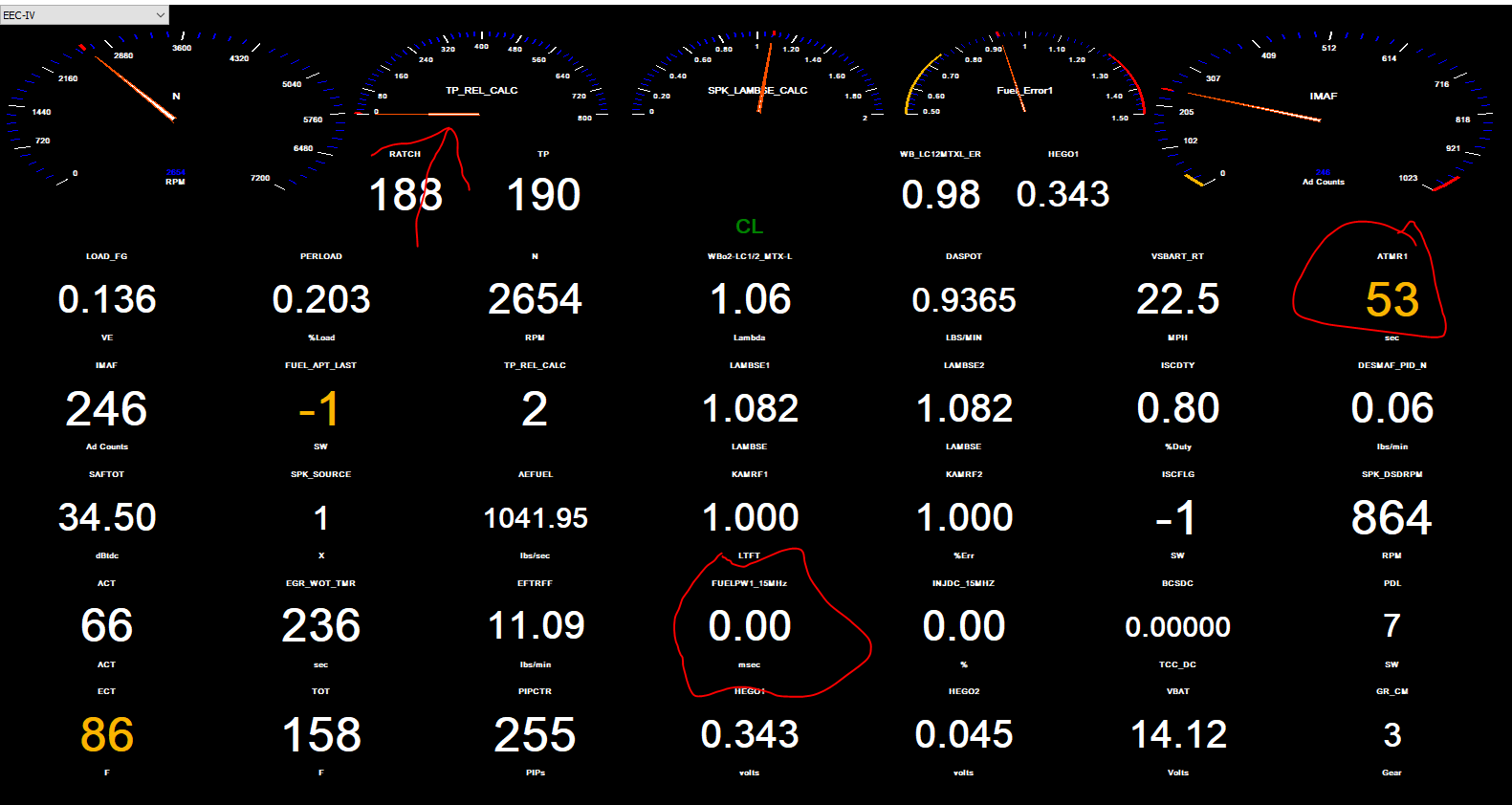 The datalog clearly shows the injectors are shutting off at decel. With the .1 decel time, I can see the injectors go to 0 pulsewidth for about the same time the decel time is set to. My datalog captures 7 cycles per second and its 2 cycle difference from 0pw back to seeing pulsewidth and about 4-5 cycles before the pulsewidth is above the ford recommended minpw. I just checked my tune and I can see that the MinPW is set to .099 which is way lower than the ford spread sheet of .599. I changed it to .599 but it changes to .401 after its saves so I guess Ill see what happens with that. I attached a couple screen shots showing the dashboard. I also don't understand how the pulsewidth drops below the min pw setting. I get 0.00 with a min pw of .099 so i don't feel like it's the problem and something else is shutting them off.