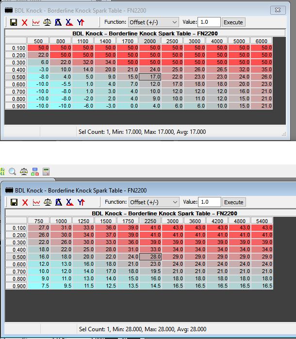I'm not exactly sure what spark tables would need to be modified, but I looked at FN2200 (Borderline knock), which appears to be the only one referenced in your 'minimum values' list, and they're definitely different. At .500 and 2000 RPM on the FBFG2 tune, it's 17*, but on the FBGI0 tune, at the same cell, it