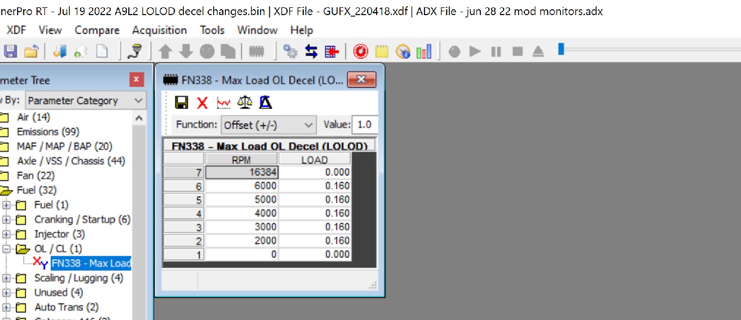 Go to an earlier post in this thread where I posted a screen grab of fn338 to see how I have it setup. I essentially have it set to .17 load at all rpms so anytime I decel in pops into OL