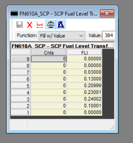 My fuel level indicator (in dash) has been way off since replacing the in-tank fuel pump. The response is very non-linear. So I've been attempting to correct the transfer function FN610A, but there doesn't seem to be any obvious change in needle response. Is FN610A not the correct function to "calibrate" the dash needle indication? The attached image shows the amount of correction I've made with no noticeable change.
