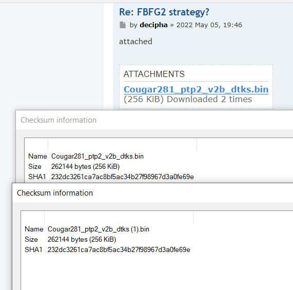 No, the 'Cougar281_ptp2_v2b_dtks.bin' file you posted at 19:46 Central is the one I downloaded, and it's working pretty much exactly like the MGZT file with the fuel pump modifications. Which is good. I'll just have to try to figure out why the start/idle is different from the PTP2/FBFG2 tune - could be a MAF scaler or something as earlier today, when I was looking at my original PTP2 and the MGZT tunes, the MAF scalers did seem to be different. Not by a ton, but it could be enough.