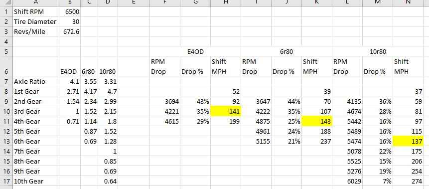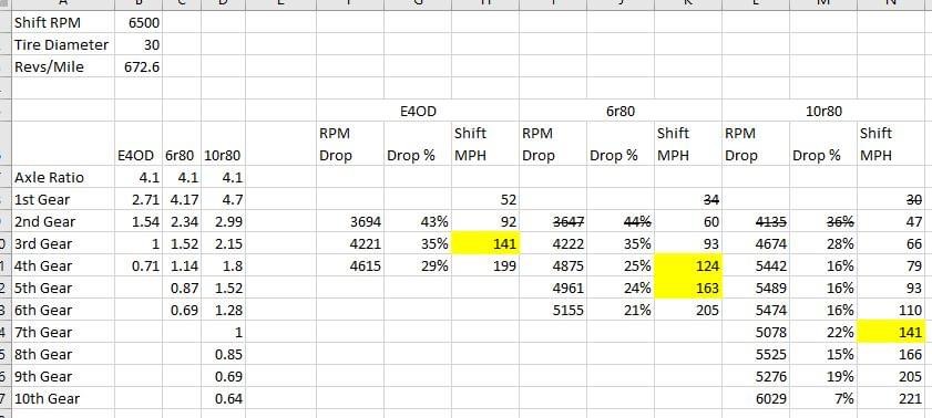 did some math... with a 4.10, 1st gear looks useless with a 10r80 and maybe even a 6r. I think a 10r would need a shorter axle gear or lockout 1st gear. RPMs stay in the sweet spot for my centri though.