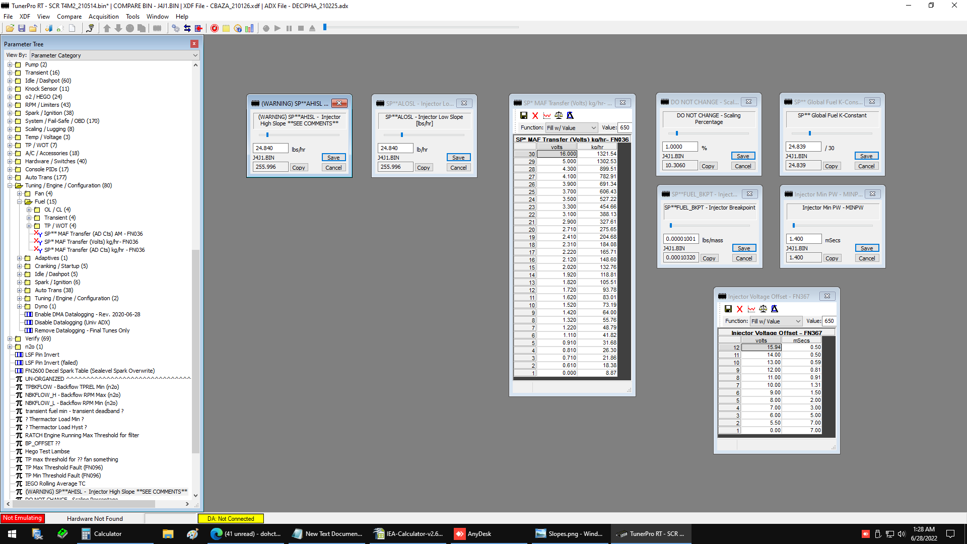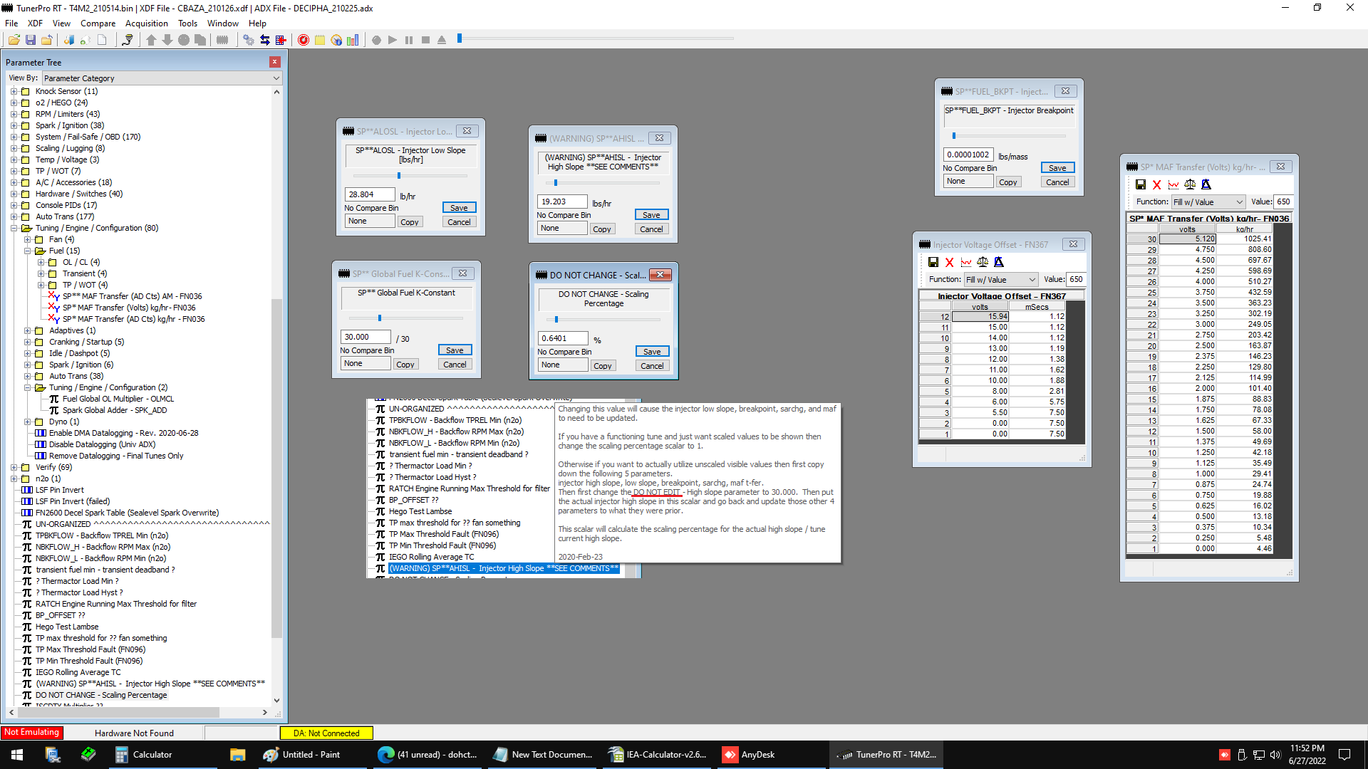 I have a known, good CBAZA tune, but when I try to drop the MAF transfer, injector slopes, breakpoint and offset into T4M2, the engine gets a bad lean pop and fueling is off. There is something I'm not grasping about the descriptions and instructions concerning the slopes, scaling percentage and k constant. I see no DO NOT EDIT - High slope parameter that is mentioned. I have the OEM, 24Lb, Cobra injectors and data. Could someone please spell out what I need to enter, in order to use and display my known good data and MAF transfer? I assume my data is getting scaled wrong, due to my mistake / misunderstanding.