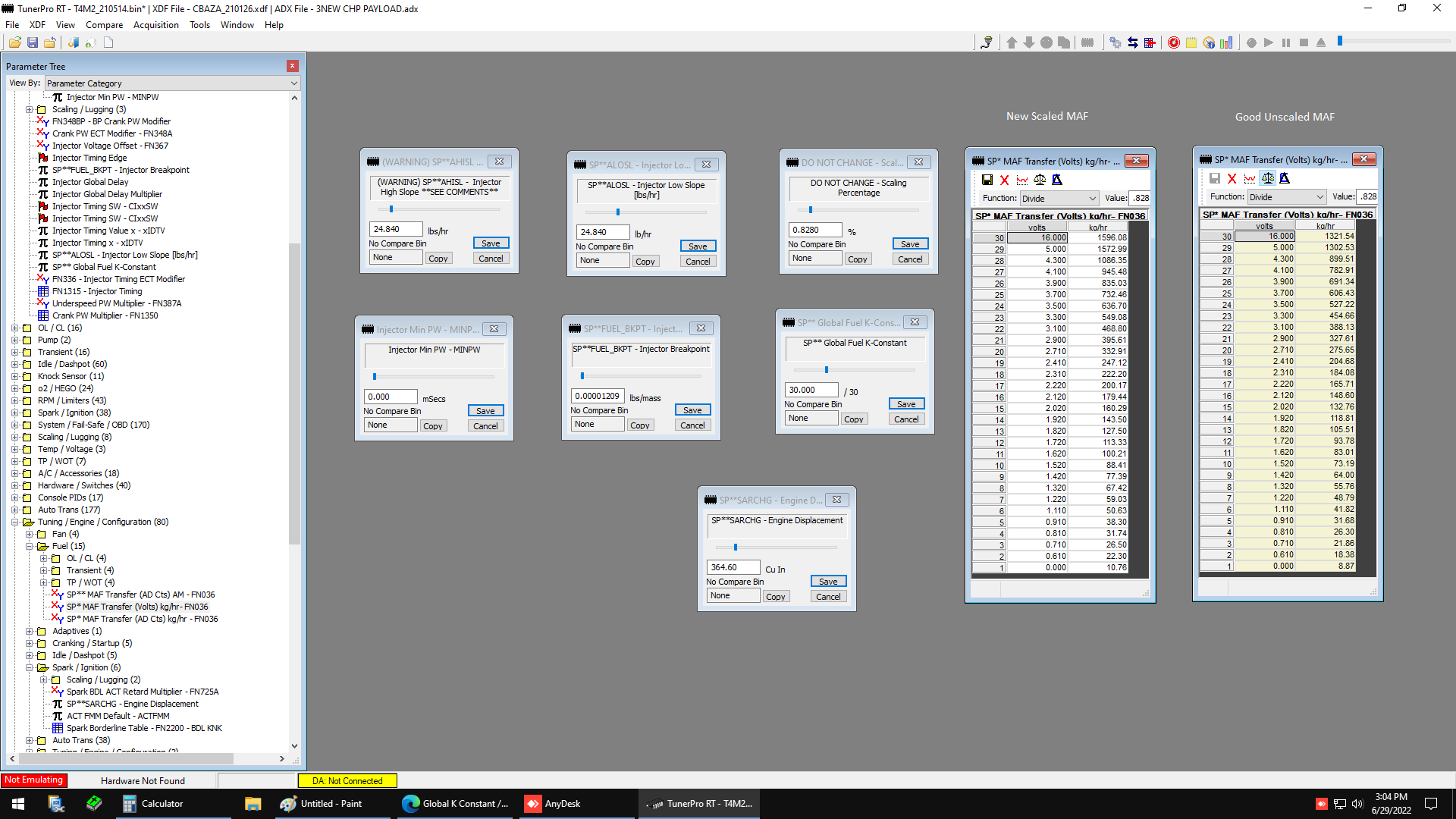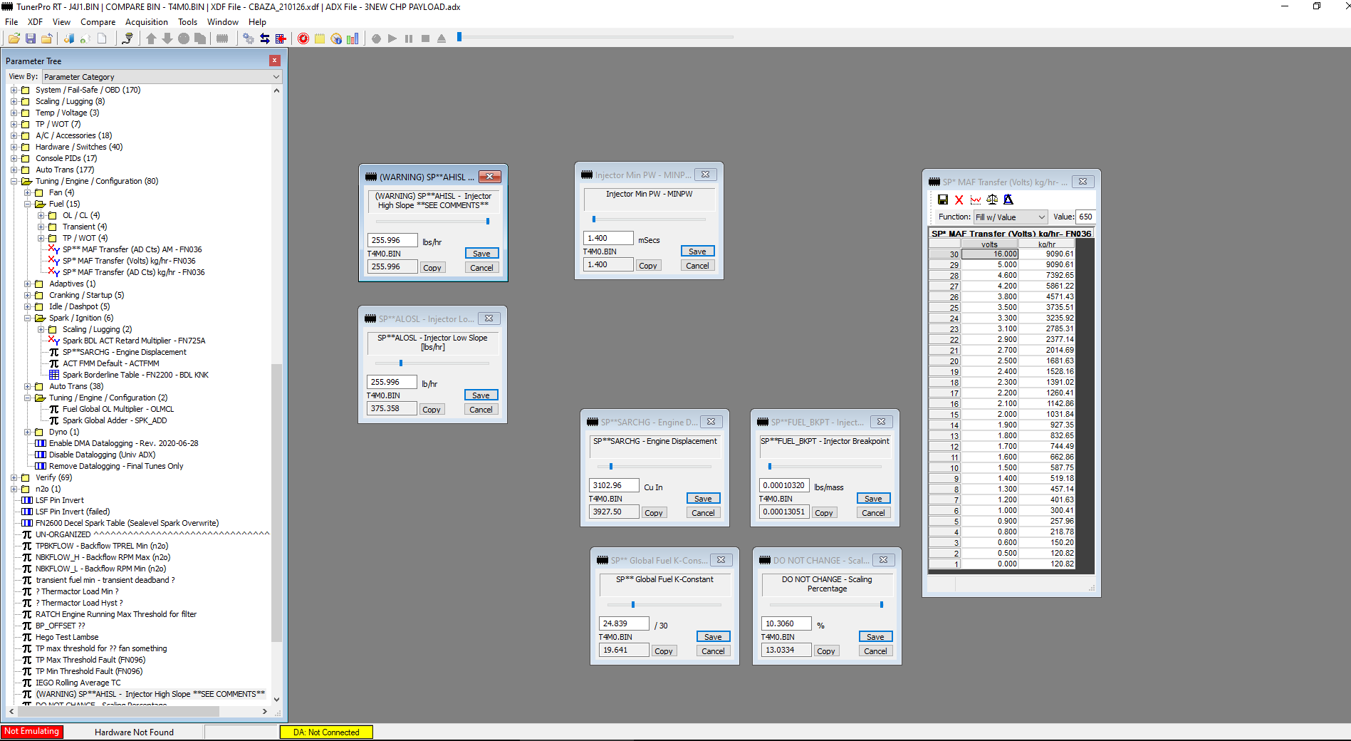 Okay. I changed only the high slope to 24.84 first, in a fresh T4M2 bin. I enter the low slope of 24.84 - I try to pull the MAF curve from a good tune, from within the compare feature - the known, good, MAF transfer in compare has increased all kg/hr entries up one decimal point. Seems to multiply them by 10.306, which is the J4J1 scaling % which has not been entered at all, only shown in compare. I change SARCHG to 301.89 - K constant stays at 30. Scaling % goes to .8280 automatically.