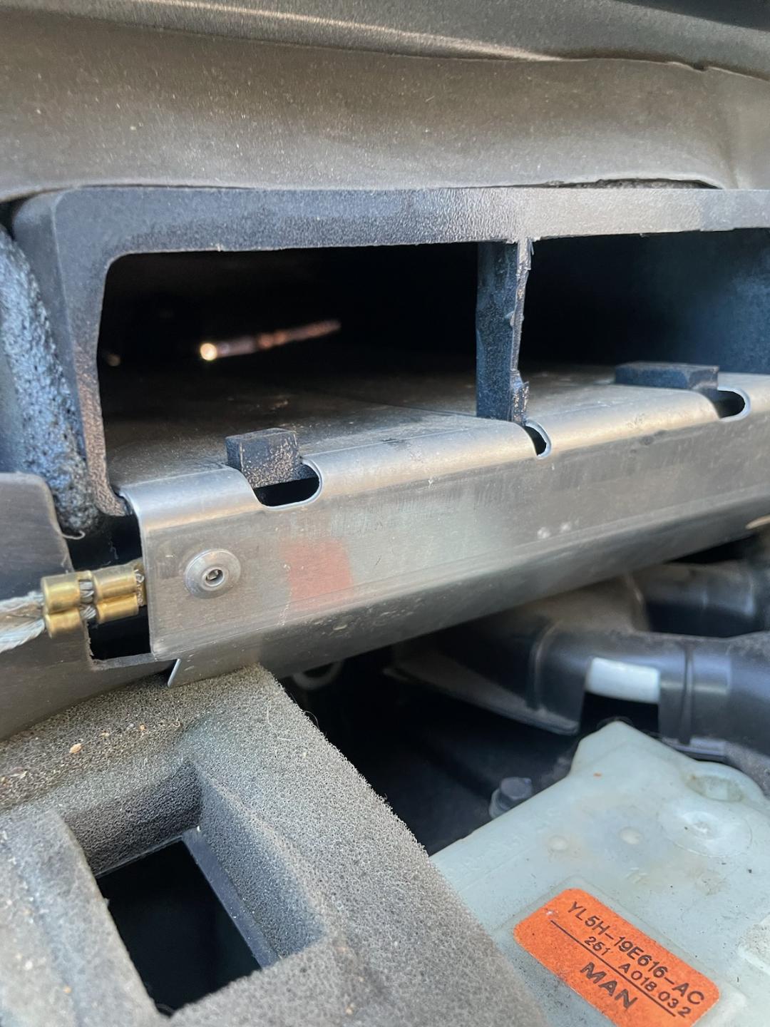 I contacted an Explorer friend who has his dashboard removed form his truck during a full build. In the picture you can see a little vertical bridge. It would interfere with the Moates QH. I went back home to my very small workshop where I have a '99 Ranger with the dash PAD dissected off of the AC/heater and ductwork assembly and I could barely see the back of the PCM pocket. I could see the barcode on the PCM and it was 1/4" from the vertical bridge. This piece will need cut out of the way for the Moates QH clearance. Fortunately it is plastic. I reached my hand over the blend door motor and I can get within 2" of the PCM pocket. I need a hook to snag the laptop cable as a helper sticks the cable through the pocket from underneath the hood. In my "stuff" I found a piece of 1/4" soft aluminum off of an old telephone pole. I hammered the end flat and bent it over to make a hook. The 2nd picture of the hook can be seen right up behind the pocket. When the cable gets threaded through there, only the person from the under hood side is going to be able to see it. The under dash person will have to follow the directions of the 1st person. The Mountaineer dash pad will be in place blocking visibility. The 1980 something all the way up to 2004 Mustang owners don't have this issue because of the PCM being located in the passenger kick panel. More having to do with this later.