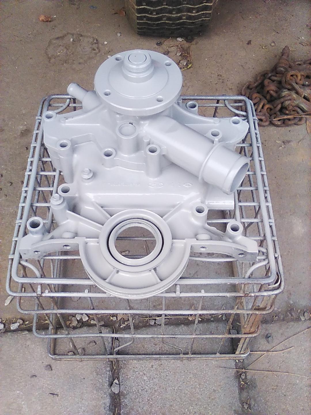 Original timing chain/gear set cover and new water pump cleaned & painted light gray sitting ready except for installing crankshaft seal.